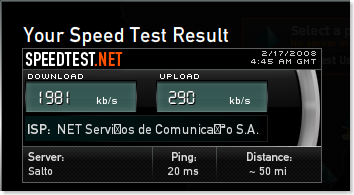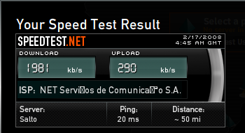 O Speedtest.net eu conheci através do blog LotusRockStar.com. Fiz o teste e achei muito interessante o resultado. Eu estou utilizando NET e pelo resultado do teste a velocidade de download e upload estão dentro do que tenho contratado (2Mb download). Veja a figura: