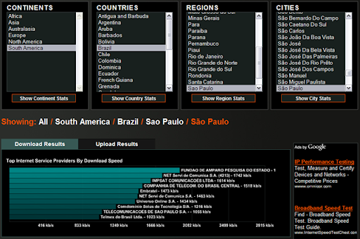 O legal desse site é que você ainda pode dar uma nota de 1 à 5 para o seu ISP. Outra pontos que achei interessante são de você poder salvar o seu teste para comparações e também de verificar a velocidade dos principais provedores em uma determinada cidade. Abaixo coloque o de São Paulo: